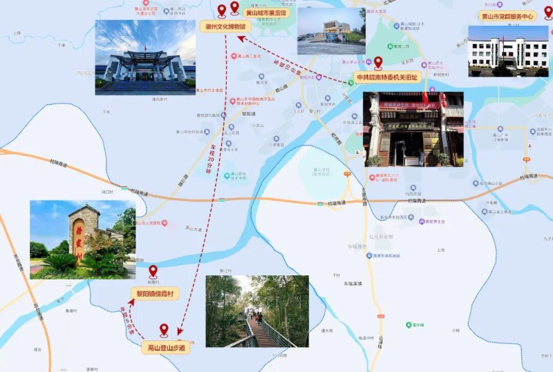 中共皖南特委机关旧址:土地革命时期皖南地区革命斗争领导机关驻地,省级爱国主义教育基地。——(车程约10分钟)——徽州文化博物馆:徽州文化展示窗口。——(车程约20分钟)——鬲山登山步道:运动康养微旅游目的地。——(车程约5分钟)——黎阳镇傍霞村:全省首批和美乡村精品示范村、省级乡村干部实训基地。