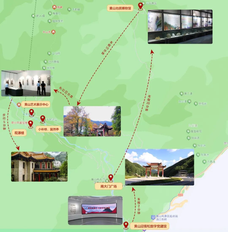 黄山迎客松数字党建馆:重温习近平总书记给“中国好人”李培生胡晓春重要回信精神,了解全国先进基层党组织——“黄山迎客松党委”工作经验成效。——(车程2分钟)——南大门广场:牌坊是黄山标志性建筑、浮雕群呈现徽州石雕技艺非遗传承及黄山作为世界文化遗产的双重价值。——(车程20分钟)——黄山地质博物馆(可选项):联合国教科文组织多次现场考察重点场馆。——(车程10分钟)——小补桥、翼然亭:1939年周恩来留影地(叶挺拍摄);全国重点文物保护单位。——(步行20分钟)——黄山艺术展示中心:全国唯一以一座山命名的画派——黄山画派艺术精品展示阵地。——(步行5分钟)——观瀑楼:邓小平曾在此居住并发表“黄山谈话”,全国重点文物保护单位。