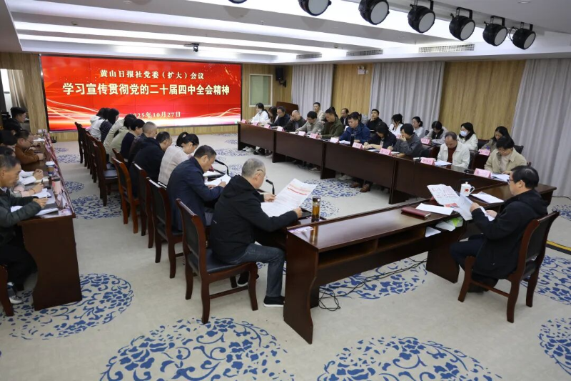 10月27日下午,黄山日报党委召开(扩大)会议,专题学习宣传贯彻党的二十届四中全会精神,并对报社学习、宣传、报道工作作出动员部署。报社党委班子成员、编委委员及行政、采编、经营、技术部门负责同志以及二级机构中层以上和各支部支委40余人参会。