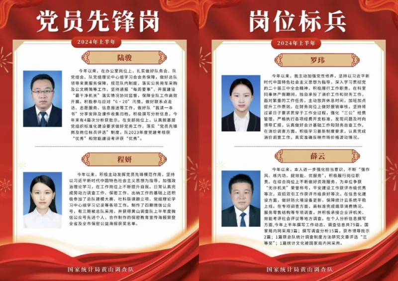 黄山队把党员干部政治素质、业务能力、工作作风、表率作用量化到日常工作中,通过细化指标、赋分测评,在实施《黄山调查队党员先锋岗及岗位标兵评选办法(试行)》(黄调字〔2024〕3号)基础上,探索建立党员干部“先锋指数”量化考核评价体系,让“先锋标准”看得见。