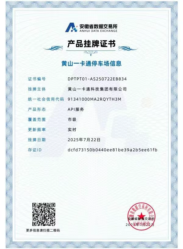 在学习教育访企入村工作中,数字黄山建设推进科青年干部在调研黄山一卡通科技集团有限公司过程中,发现企业对数据价值“变现”存在迫切需求,立即协调省数据交易所,组织专家团队全程指导,仅用1个月即完成从需求对接到产品挂牌的全流程工作,7月22日,“黄山一卡通停车场信息”获省数据交易所颁发的《产品挂牌证书》,实现我市在省级平台挂牌交易的数据产品“零的突破”。