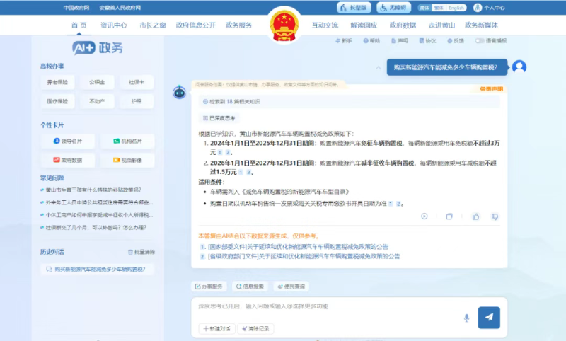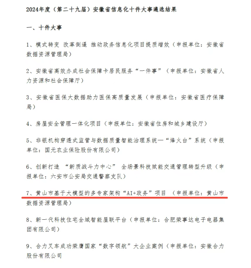 7月31日,由信息中心青年团队开发的“黄山市基于大模型的多专家架构 ‘AI + 政务’项目”,入选安徽省信息化十件大事,该系统从企业、群众及游客的实际需求出发,依托黄山市政府网站、政务服务网、政务新媒体、皖事通APP等平台,深度融合DeepSeek、文心一言、通义千问、豆包等多个大模型技术优势,实现“智能搜索+智能问答”一体化咨询服务。